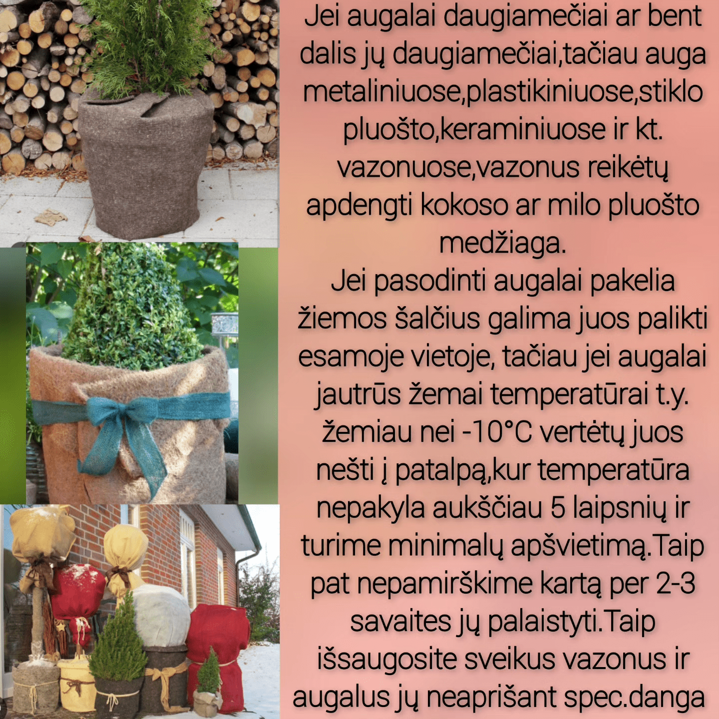 Konsultacijos augalų priežiūros klausimais, sodinamos vietos parinkimas, grunto pritaikymas,tręšimas. Konsultuojame gyvai ir internetu. Esant poreikiui parūpiname reikalingas medžiagas augalų auginimui.